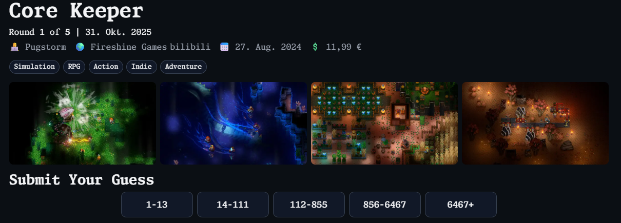 Täglich um 02:00 Uhr erscheint eine neue Runde mit fünf Steam‑Spielen. Zu jedem Titel zeigt das Spiel Screenshots und ein paar Metadaten. Aufgabe: die Gesamtzahl der Reviews (positiv + negativ) schätzen. Nach jeder Eingabe folgt die Auflösung und am Ende die Gesamtauswertung.