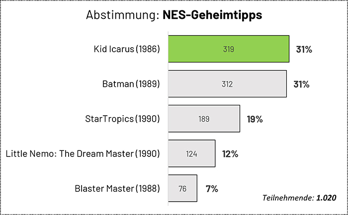 Super Stay Forever: Welchen NES-Geheimtipp sollen Fabian und Gunnar würdigen? Diese Frage haben unsere Unterstützerinnen und Unterstützer durch eine Abstimmung beantwortet, und das Ergebnis war denkbar knapp: Bei mehr als 1.000 Teilnehmern gewinnt Kid Icarus mit einer hauchdünnen Mehrheit von sieben Stimmen vor dem zweitplatzierten Batman. Nun denn, spannt die Bögen, wir begleiten Pit auf seinem Abenteuer!