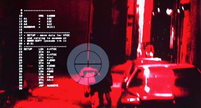 Anhand von HD-Frames weist pagetable.com nach, dass die Overlays in „The Terminator“ Apple-II-Code aus Nibble Magazine sind. Sichtbar sind u. a. Equates, ein Dump der Maschinenbefehle und die Key-Perfect-Checksum-Ausgabe („Program Check 0502“), die die Quelle eindeutig belegt.