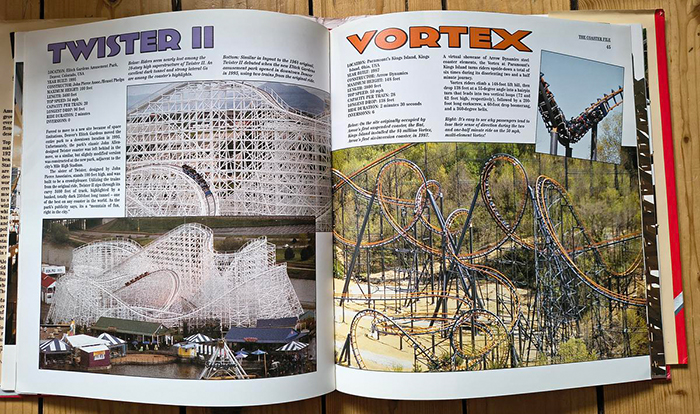 Und noch ein Nachtrag: In unserer Folge zu Rollercoaster Tycoon haben wir davon erzählt, dass Chris Sawyer durch den Bildband White Knuckle Ride von Mark Wyatt zu seinem Achterbahn-Spiel inspiriert wurde. Und zwar ganz spezifisch von der Doppelseite 44/45, auf der die Holzachterbahn Twister II und die Stahlachterbahn Vortex nebeneinander zu sehen sind. Wir hätten diese Doppelseite gern in den Kapitelbildern gezeigt, nur gibt es die online nirgendwo zu sehen. Am Ende siegte bei Chris die Neugierde, und so hat er sich den Bildband gebraucht gekauft – immerhin ist das ja auch ein kleines Stück Spielegeschichte. Hier ist sie nun, die legendäre Doppelseite: