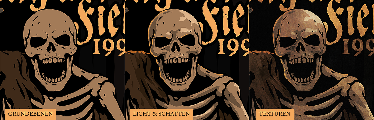 In seinen Grundzügen ist das seit Tag eins so geblieben. Mein Stil entwickelt sich aber natürlich auch weiter. Zum einen arbeite ich inzwischen fast immer mit harten Outlines um die Figuren herum, es sei denn, das Motiv soll „gemäldeartig“ sein, wie bei Morrowind oder King’s Quest. Zum anderen nutze ich inzwischen doch wieder verstärkt klassische, weiche Pinsel. Warum? Die Vektor-Schatten sind von Natur aus sehr hart. Mit den Pinseln setze ich final noch sanftere Übergänge, was dazu führt, dass neuere Motive deutlich plastischer wirken. Schaut euch bei King’s Field den Sprung von Schritt 2 zu 3 mal an, da sieht man das sehr schön.