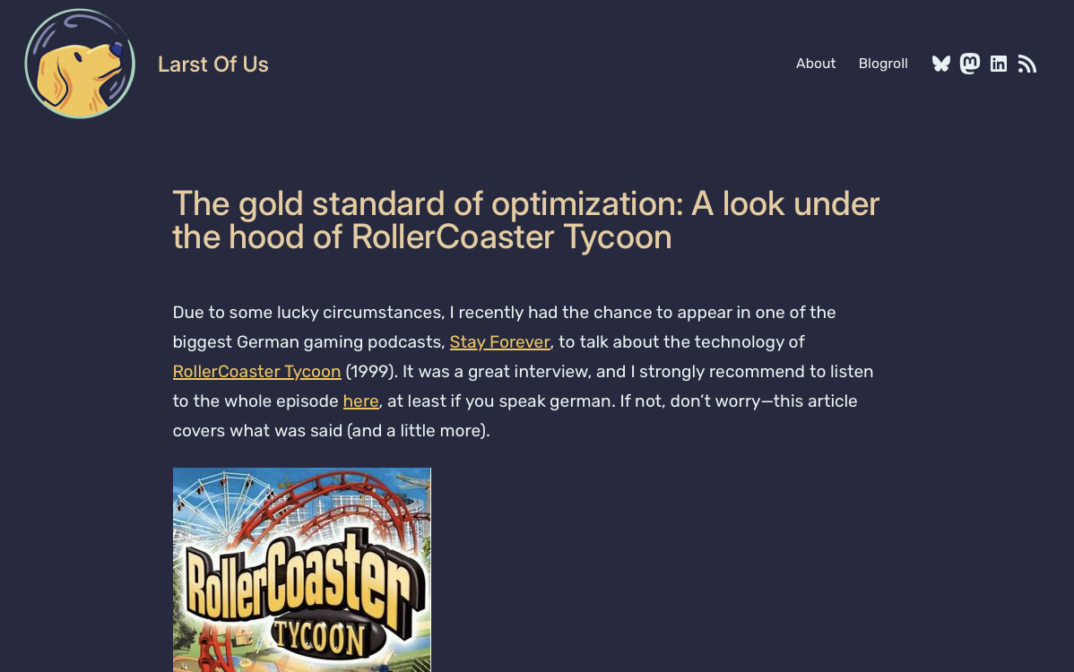 Lars Thießen, der in unserer Folge zu RollerCoaster Tycoon als Experte zu Gast war, hat auf seinem Blog einen begleitenden Artikel veröffentlicht, der die im Podcast angesprochenen Themen weiter ausführt. Im Zentrum steht die Frage, wie ein Spiel von 1999 ganze Freizeitparks mit tausenden Agenten simulieren konnte, während viele moderne Aufbauspiele bis heute mit stabiler Performance kämpfen.