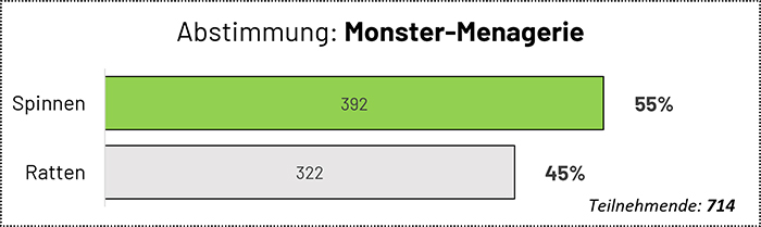 Diverse Sachen sind in der Mache, darunter natürlich auch eine neue Folge Monster-Menagerie, die kommt allerdings erst im Dezember. Aber wir haben schon mal eine Abstimmung unter den Unterstützenden der Stufe “Gutaussehender Mäzen” (und darüber) für das neue Thema gemacht, ein Novum in der Geschichte des noch jungen Format. Hintergrund: Wir konnten uns zwischen zwei Sorten Krabbelvieh nicht entscheiden, das ist jetzt per Hörenden-Votum geschehen. Und gewonnen hat das fiese, haarige Vieh, ihr wisst schon. Ergebnis siehe hier:
