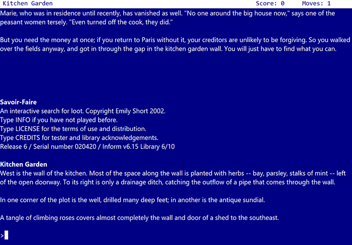 Stay Forever Spielt: Savoir-Faire. Im Jahr 2002 erschien das von uns sehr geliebte moderne Textadventure 1893: A World’s Fair Mystery, das wir vor Jahren bei Stay Forever Spielt als Thema hatten. Das Spiel gewann damals bei den XYZZY-Awards, dem jährlichen Preis der Interactive-Fiction-Community, den Preis für das beste Setting. DER Abräumer des Jahres war aber ein anderes Spiel: „Bestes Spiel”, „Beste Story”, „Beste Puzzles”, „Bester Spielcharakter”, gleich vier Titel gingen an … Savoir-Faire. Das Textadventure der profilierten Autorin/Designerin Emily Short gilt bis heute als Meisterwerk der modernen Interactive Fiction. Und das knöpfen Chris und Gunnar sich nun vor, auch deshalb, weil sie schon lange mal ein Spiel von Emily Short spielen wollten. Begleitet uns in dem Mix aus Historien- und Fantasy-Spiel in eine aristokratische Welt, in der wir unser fürstliches Elternhaus nach dem verschwundenen Vater durchsuchen (oder besser gesagt: nach dessen Wertsachen).